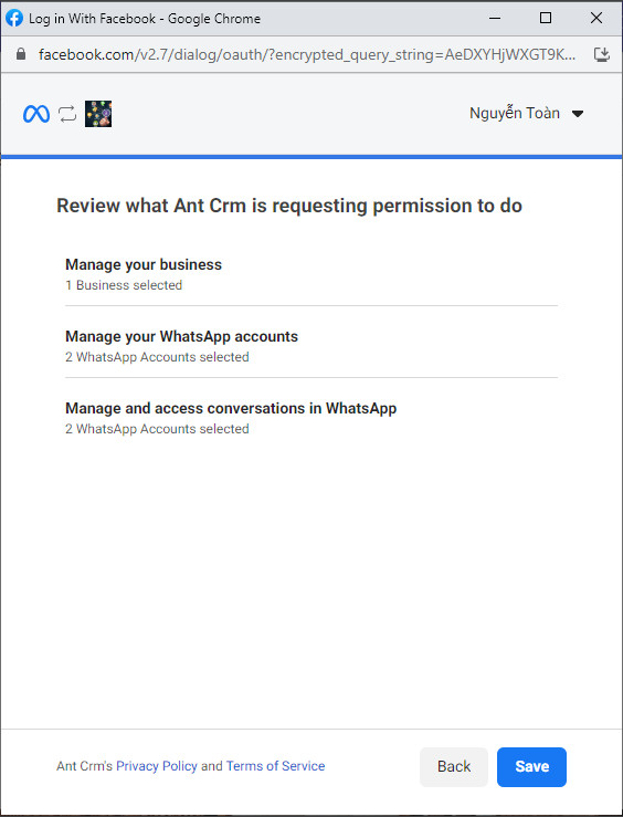 Step 3: In the authentication popup, select FB account is an admin of the connected fanpage with WhatsApp.
