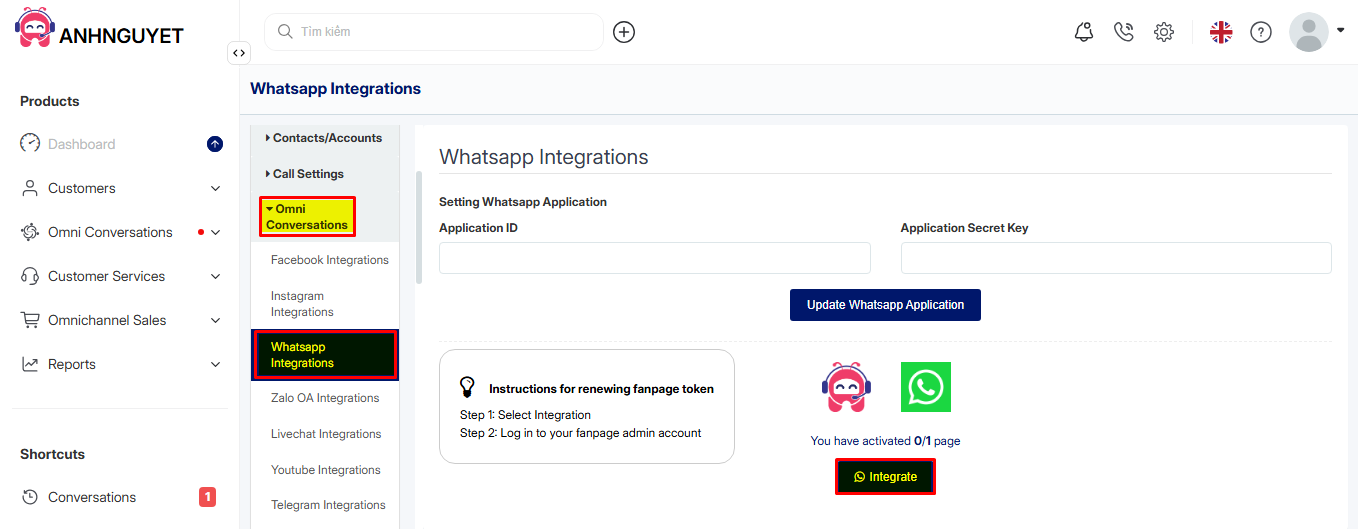 Step 1: Go to Settings -> Omni Chat -> WhatsApp Integrations